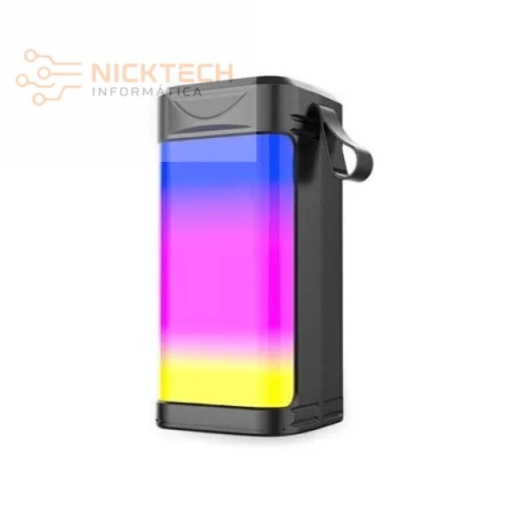 Potencia: 5W Resposta de frequência: 45Hz / 18KHz Capacidade da bateria: 1200mAh, Tempo de carregamento: de 2h a 3h Tempo da música: de 4h a 6h Recursos: Bluetooth, Cartão de Memória Micro SD, Auxiliar Luz Colorida