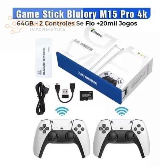 Experimente a impressionante qualidade de imagem 4K, juntamente com 2 controles sem fio de 2.4GHz para multijogador sem fio. Aproveite as horas intermináveis de diversão com o Blulory M15! Caracteristicas: Nome: M15 Pro Game Stick 4K Processador: GB2 Cortex-a7 1.0 GHZ de núcleo duplo Memória DDRIII 256M Sistema: Sistema de fonte aberta Emuelec4.3, expansão de cartão TF de suporte, Max 128GB, suporte para baixar jogos de formatos relacionados, suporte mais grandes jogos 3D. Jogos de 64GB (20000+ Jogos) PSP,PS1,N64,CP1,CP2,CP3,Neogeo,GBX,MAME, FC.FCE,SFC,GB.GBA.GBC.MDNGPC,MEGADRIVE,GAMEGEAR,SEGA GENESIS, e outros simuladores