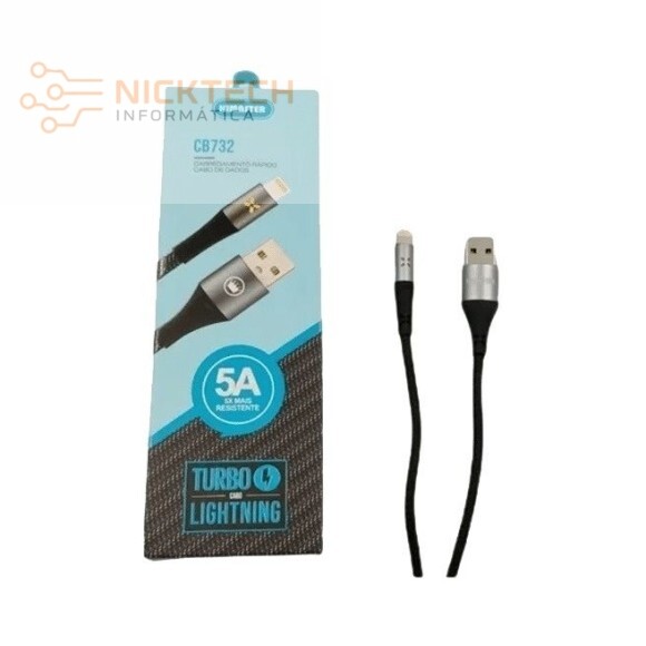 - Cabo Lightning de 1 metro com suporte para Quick Charge 5A, oferecendo carregamento super rápido e seguro para dispositivos Apple