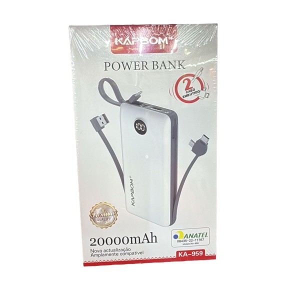 O modelo KA-959 é um power bank portátil com capacidade de 20000mAh e display digital LCD.