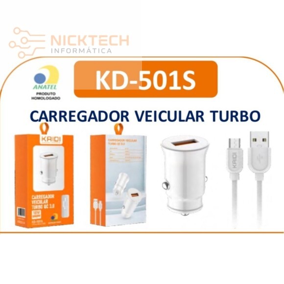 CARREGADOR VEICULAR TURBO V8 USB 3.0 18W KAIDI KD-501S