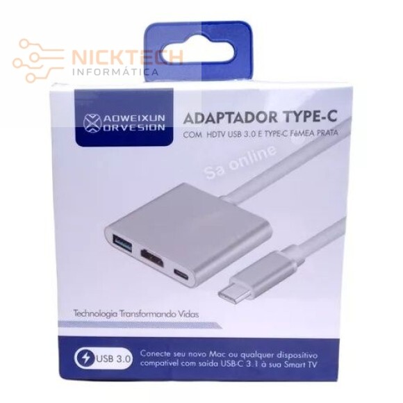 Com o cabo adaptador Type-C 3 em 1 da Aoweixun Orvesion é possível realizar transmissões de vídeo em alta velocidade, alcançando até 5.4GPS por linha e resolução 4096 x 2160 | 4K. Acompanha saída Type-C e entradas Type-C fêmea, HDMI fêmea e USB 3.1fêmea.