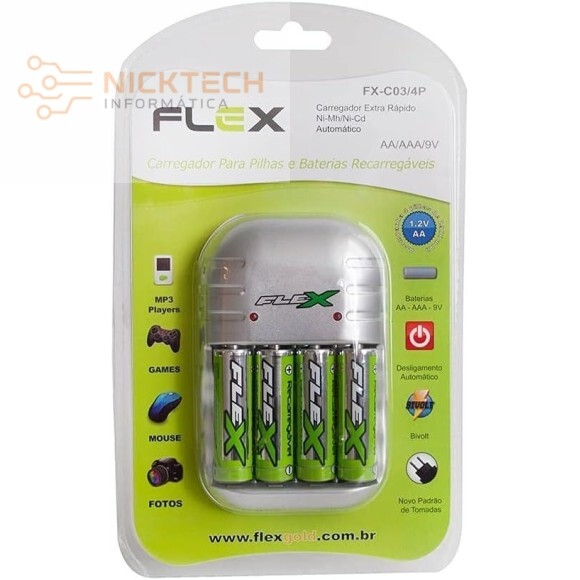 CARREGADOR DE PILHAS FLEXGOLD AA/AAA/9V FX-C03-4P C/ 4 PILHAS AA (R#)